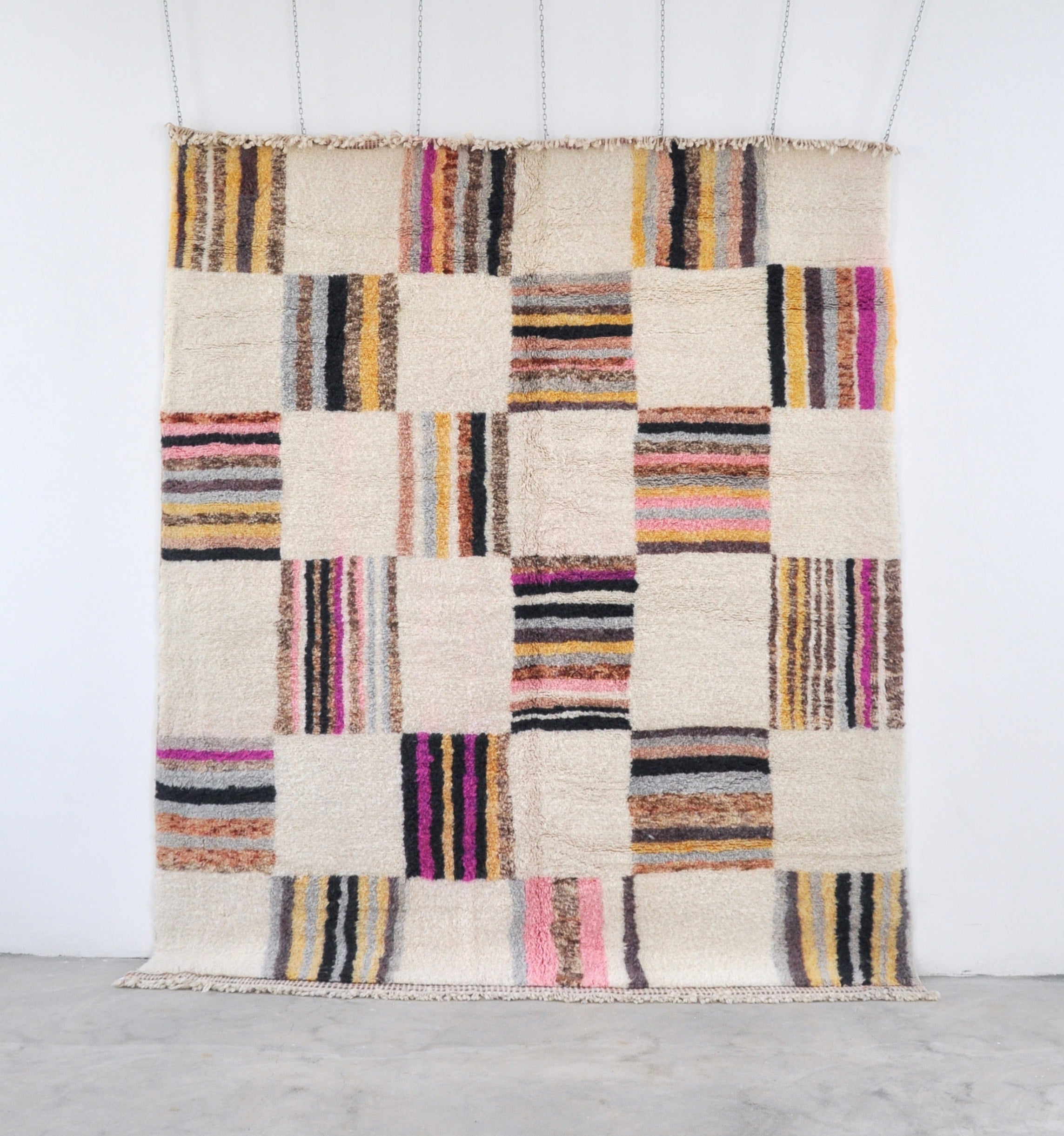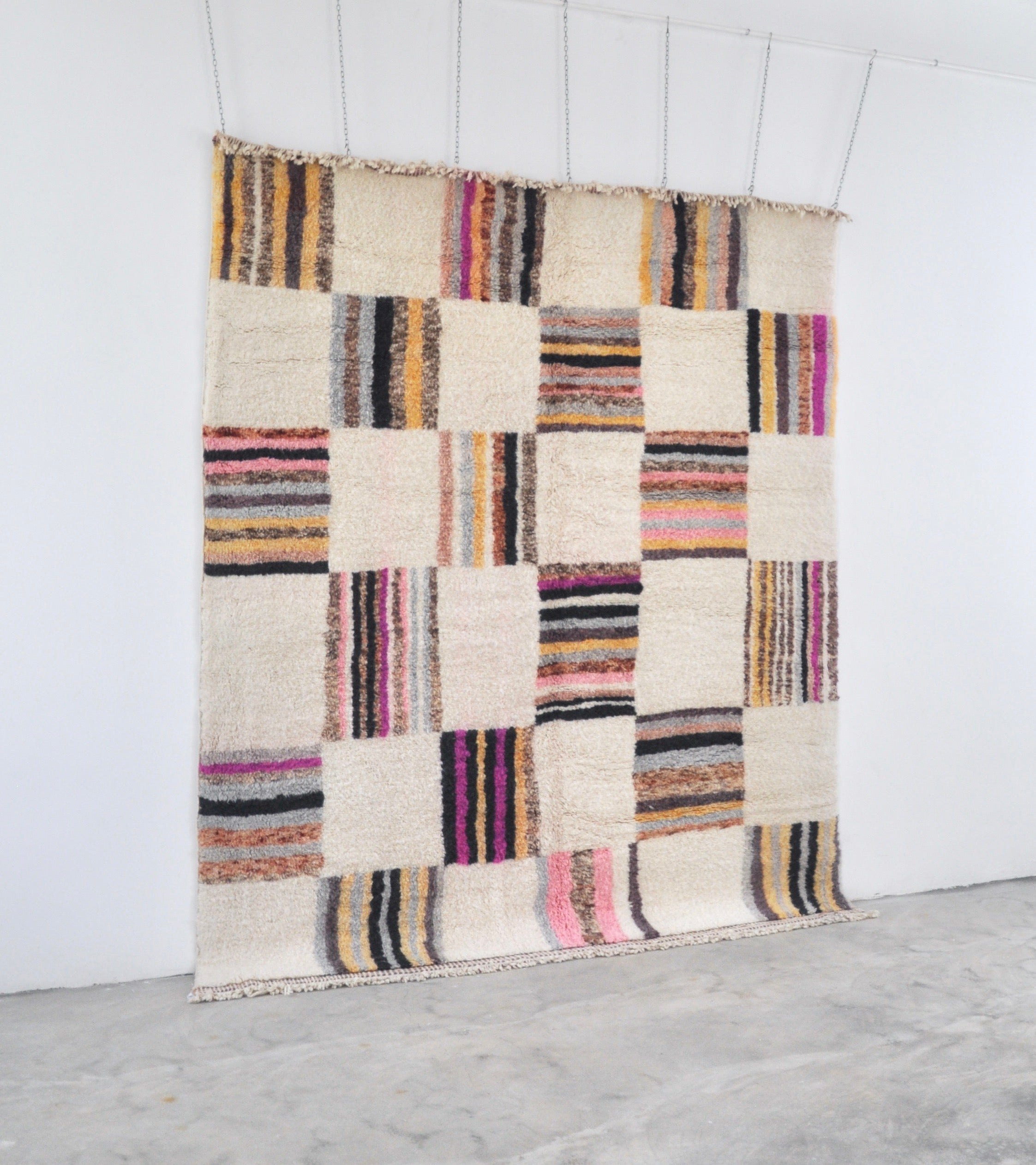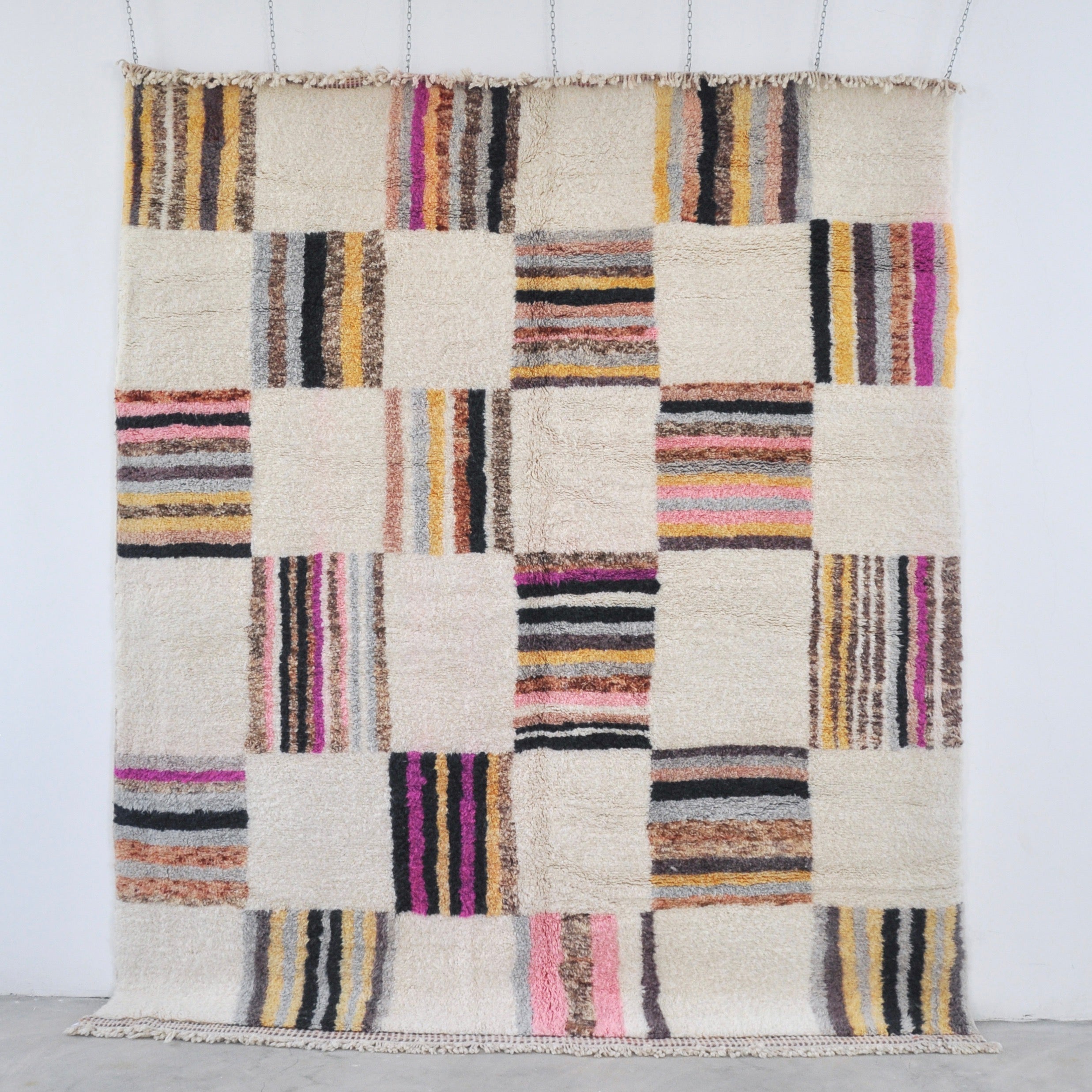 Fluffy-woven rug Ghadija in 'Multicolor Checkerboard' on white, thick weave unique design.